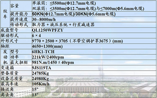 ★底盤:采用慶鈴公司生產(chǎn)的QL1250WPFZY二類底盤,6*4驅(qū)動,安裝可翻轉(zhuǎn)寬敞、舒適型駕駛室, 發(fā)動機(jī)采用慶鈴五十鈴6HK1-TCH柴油發(fā)動機(jī),功率221KW,國V排放標(biāo)準(zhǔn);變速器采用法士特9JS119TA型,性能優(yōu)越,越野性能好。該車型是目前國內(nèi)各油田中深測井作業(yè)設(shè)備的佳選擇之一。